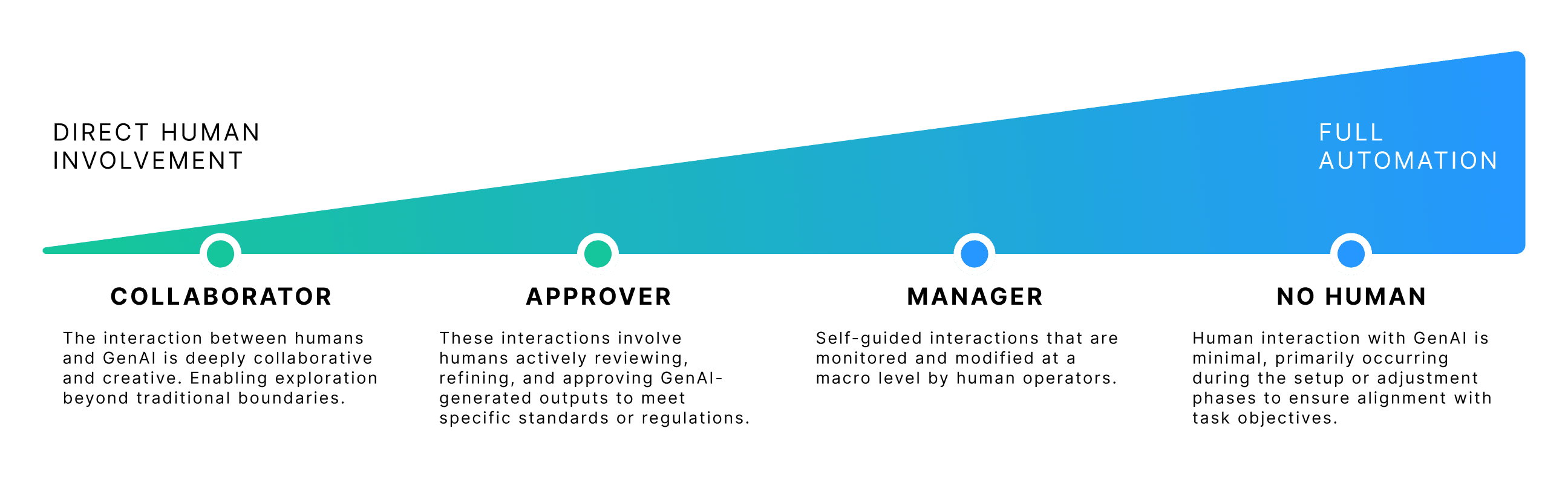 The four archetypes mapped human engagement across the AI workflow spectrum. Collaborator (deep co-creation and idea exploration), Approver (oversight and refinement of AI outputs), Manager (monitoring automated tasks with guardrails), to full automation.