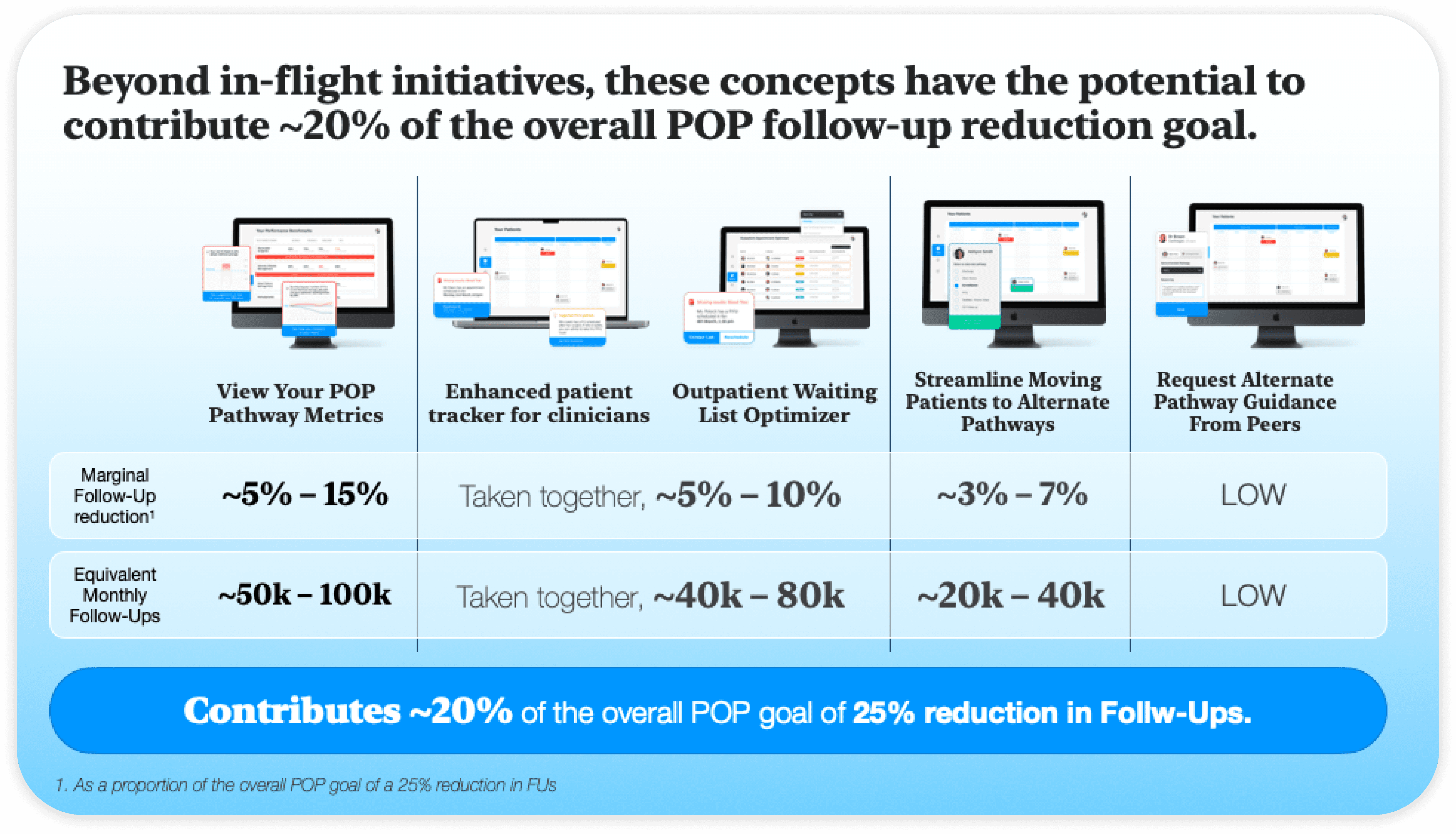 I prioritized POCs that provided System Managers and Providers with ways to track clinic performance and patient care pathways. This would drive the adoption needed to hit a ~20% reduction in follow-up appointments.